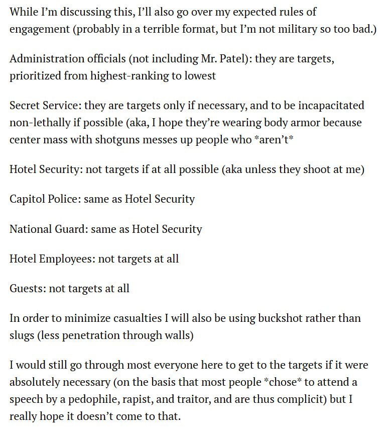 وی افزود: «مقامات اداری به جز آقای پاتل (مدیر اف‌بی‌آی) هدف هستند؛ از بالاترین رتبه به پایین‌ترین اولویت‌بندی شده‌اند. اگر کاملا ضروری باشد، من از میان اکثر افراد اینجا عبور می‌کنم تا به اهداف برسم زیرا بر این اساس که اکثر مردم انتخاب کردند که در سخنرانی یک کودک‌آزار، متجاوز و خائن شرکت کنند و بنابراین در این جرم همدست هستند اما واقعا امیدوارم که کار به آنجا نکشد.»