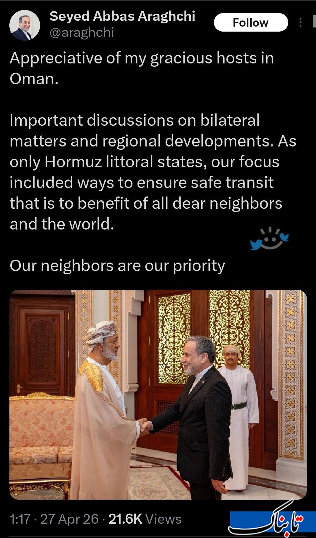 به گزارش تابناک؛ سیدعباس عراقچی، وزیر امور خارجه کشورمان پس از بازگشت از عمان در توئیتی نوشت: از میزبانان مهربانم در عمان سپاسگزارم.
