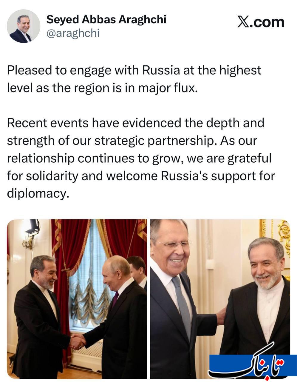 وزیر خارجه کشورمان در شبکه اجتماعی ایکس نوشت: تحولات اخیر عمق و استحکام شراکت راهبردی ما را بهخوبی نشان داده است؛ همچنانکه روابط ما در حال گسترش است، ما قدردان همبستگی موجود هستیم و از حمایت روسیه از مسیر دیپلماسی استقبال میکنیم.