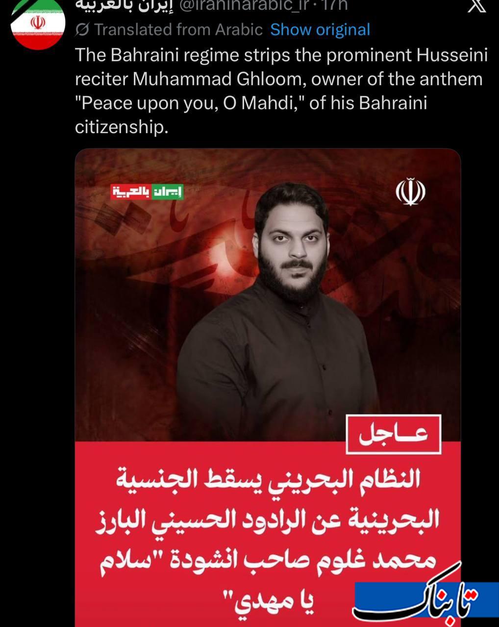 به گزارش تابناک؛ دولت بحرین تابعیت محمد غلوم خواننده مذهبی را به اتهام تمجید از دشمن یعنی ایران سلب کرد. تابعیت ۶۸ نفر دیگر نیز به همین اتهام سلب شده است.