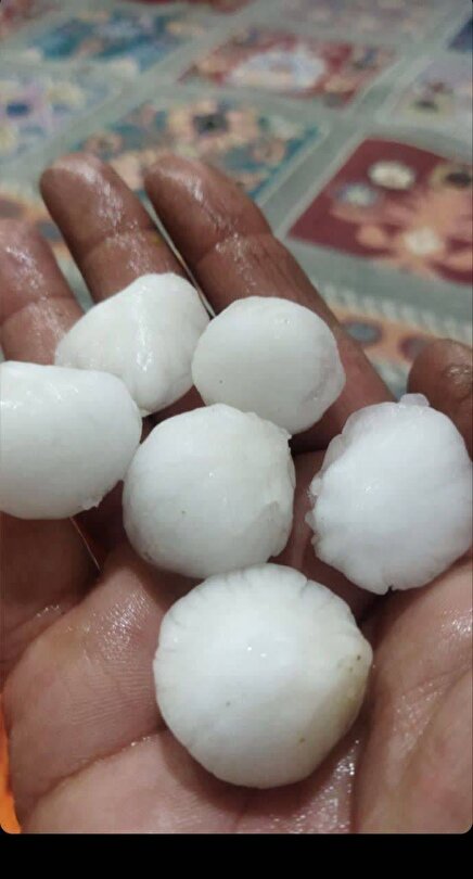 تصاویری از تگرگهای دانه درشتی که امروز در بخش برخوردار نورآباد بارید.