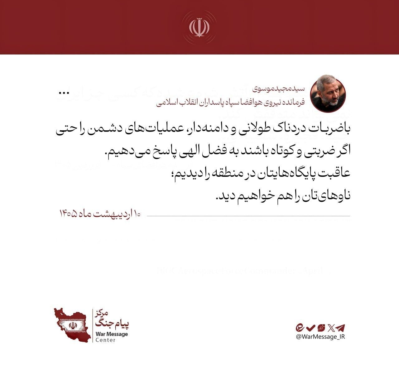 به گزارش تابناک به نقل از فارس؛ سردار موسوی؛ فرمانده هوافضای سپاه خطاب به آمریکا نوشت: با ضربات دردناک طولانی و دامنهدار، عملیاتهای دشمن را حتی اگر ضربتی و کوتاه باشند به فضل الهی پاسخ میدهیم. عاقبت پایگاههایتان در منطقه را دیدیم؛ ناوهایتان را هم خواهیم دید.