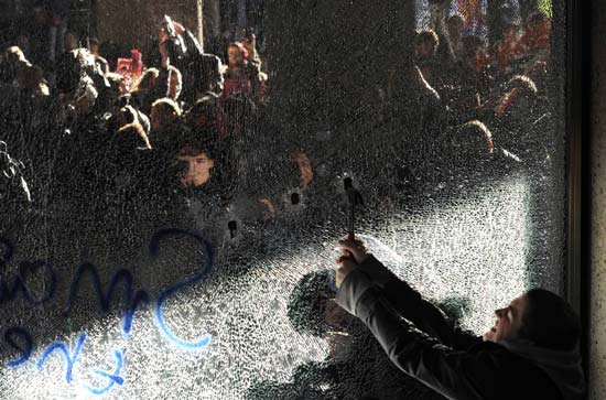 تظاهرکنندگان با حمله به دفتر مرکزی حزب محافظه کار حاکم در مرکز لندن شیشه های این دفتر را شکستند. این افراد به افزایش شهریه دانشگاه ها اعتراض کرده داشتند