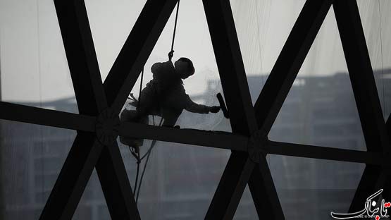 یک کارگر در حال تمیز کردن شیشههای یک برج در پکن