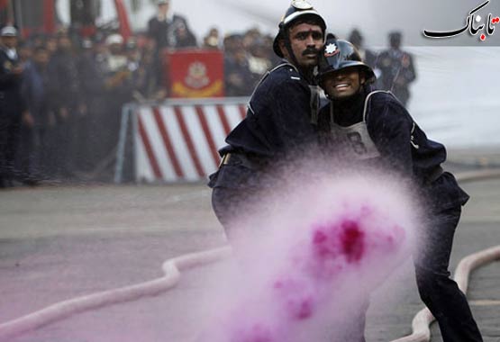 مسابقه آتش نشانی در بمبئی، آتش نشانان، در حال پاشیدن آب رنگی به هدف هستند.