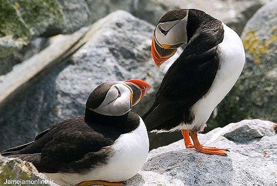 يك جفت پوفين گونهاي مرغ ماهيخوار در جزيره ماكياس سيل در سواحل ايالت مين آمريكا.