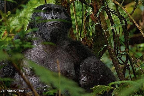 ماده گوريل كوهستان و بچهاش در پارك بيويندي.