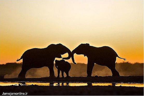 دو فيل بالغ و يك بچه فيل در كنار بركهاي در پارك ملي اتوشا در ناميبيا.