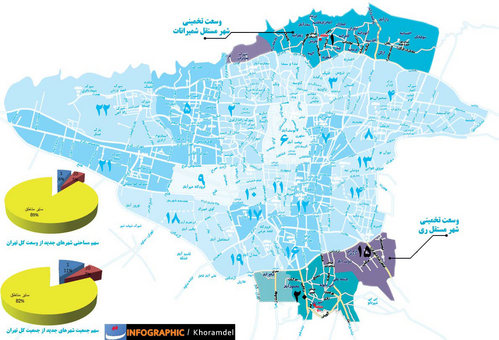 در بعد جمعیتی نیز منطقه ۶۴ کیلومتری یک و ضمائم مورد اشاره از منطقه دو، می‌تواند وسعت ۸۰ کیلومتری را شکل دهد. از سوی دیگر منطقه ۲۳ کیلومتریِ بیست به همراه بخش‌هایی از مناطق ۱۵ و ۱۹ در حدود ۵۰ کیلومتر برآورد می‌شود که این دو شهر مجموعاً ۱۳۰ کیلومتر از تهران ۷۳۰ کیلومتر مربعی را شامل خواهد شد.