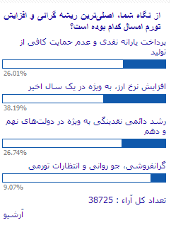 بر پایه آمار و دادههای به دست آمده از این نظرسنجی، از میزان کل آرا به رقم ۳۸۷۲۵ رأی، تعداد ۳۸.۲۱ درصد (۱۴۱۷۷ نفر) گزینه افزایش نرخ ارز را دلیل گرانی معرفی کردند که ۱۳۰۴۷ نفر از کشور به این گزینه رأی دادهاند.