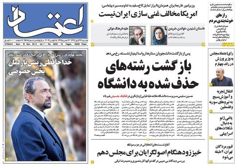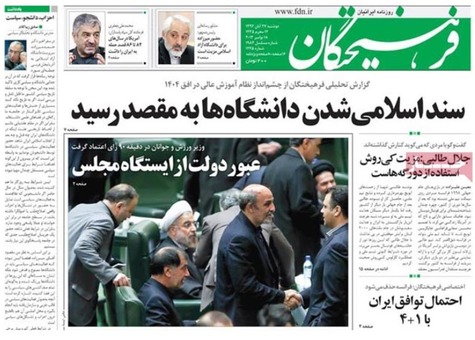 همین روزنامه مسائل مطرح در جلسات دیروز مجلس را نیز مورد توجه قرار داده و نوشته: روز گذشته محمود علوی، وزیر اطلاعات با حضور در کمیسیون آموزش مجلس، توضیحاتی در رابطه با استعلام انتصابهای وزارت علوم ارائه داد. علیرضا سلیمی، عضو کمیسیون آموزش در رابطه با جزییات این جلسه میگوید: وزیر اطلاعات در این جلسه گفت، در برخی موارد در انتصابهای وزارت علوم استعلام نشده است و در برخی موارد نیز استعلام شده است که جواب وزارت اطلاعات منفی بوده است. به گفته او، فرجی دانا وعده داد که اگر استعلامها منفی باشد آن فرد را در وزارت علوم منصوب نخواهند کرد. همچنین فرهاد بشیری، دیگر عضو کمیسیون آموزش، در رابطه با استعلامات منفی وزارت اطلاعات گفته است: از میان افراد استعلام شده فقط استعلام تعداد اندکی در حدود پنج یا شش نفر منفی بوده است: که از این تعداد فقط چند نفر در وزارت علوم منصوب شدهاند.