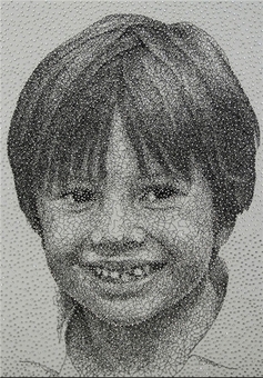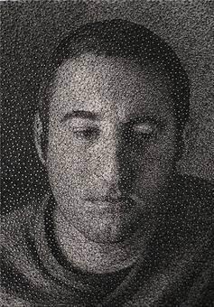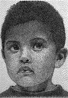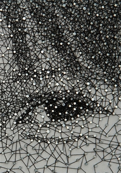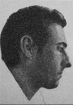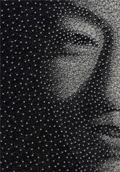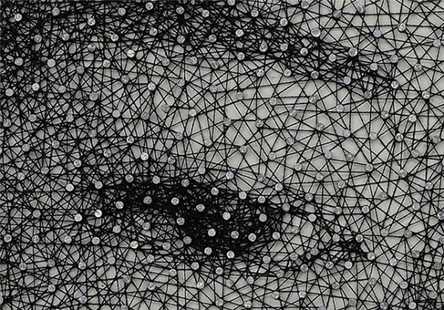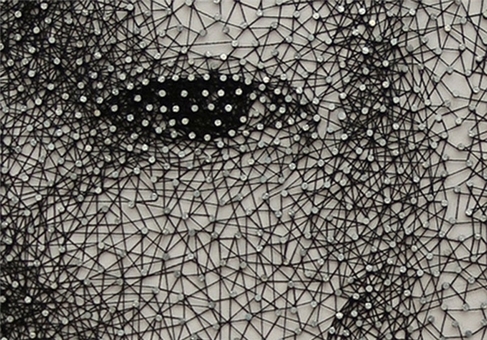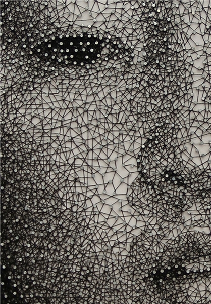 آخرین کاری که از این هنرمند مشاهده می کنید چند صد میخ و نخ سیاه روی تخته چوب سفید، پرتره های زیبایی خلق کرده است.