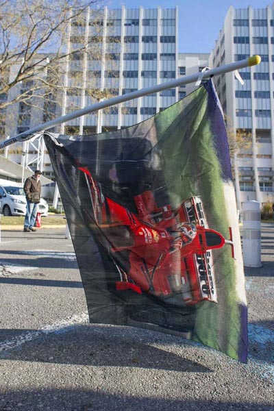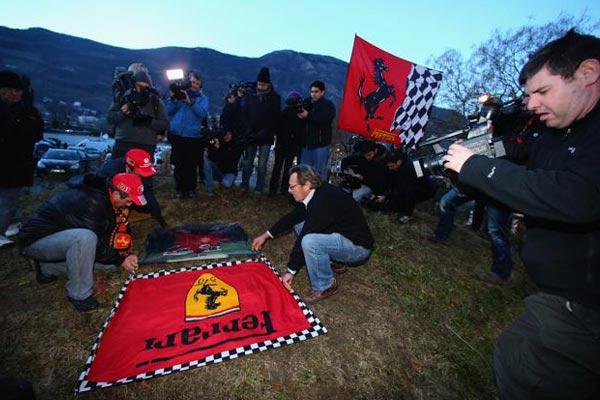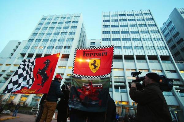 هواداران شوماخر با لباس تیم فراری در اطراف بیمارستان حضور دارند