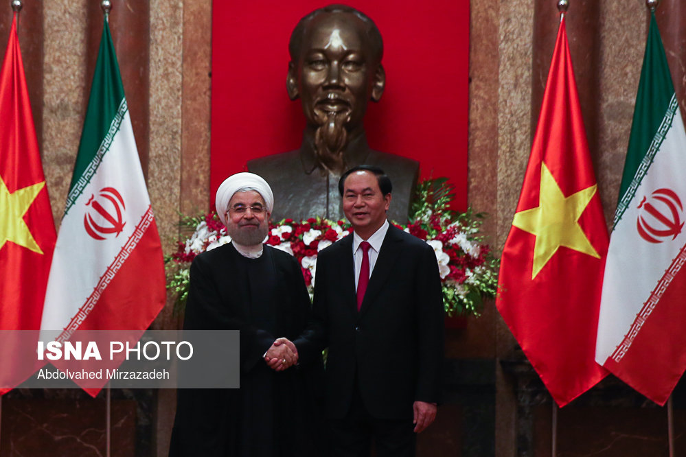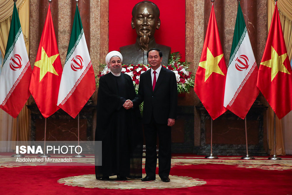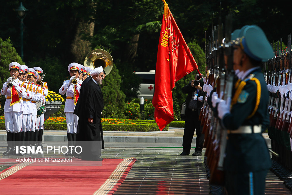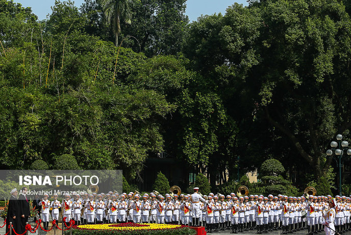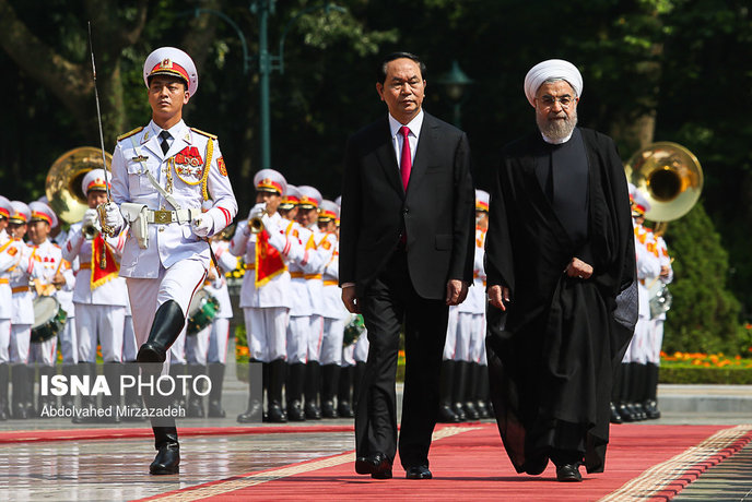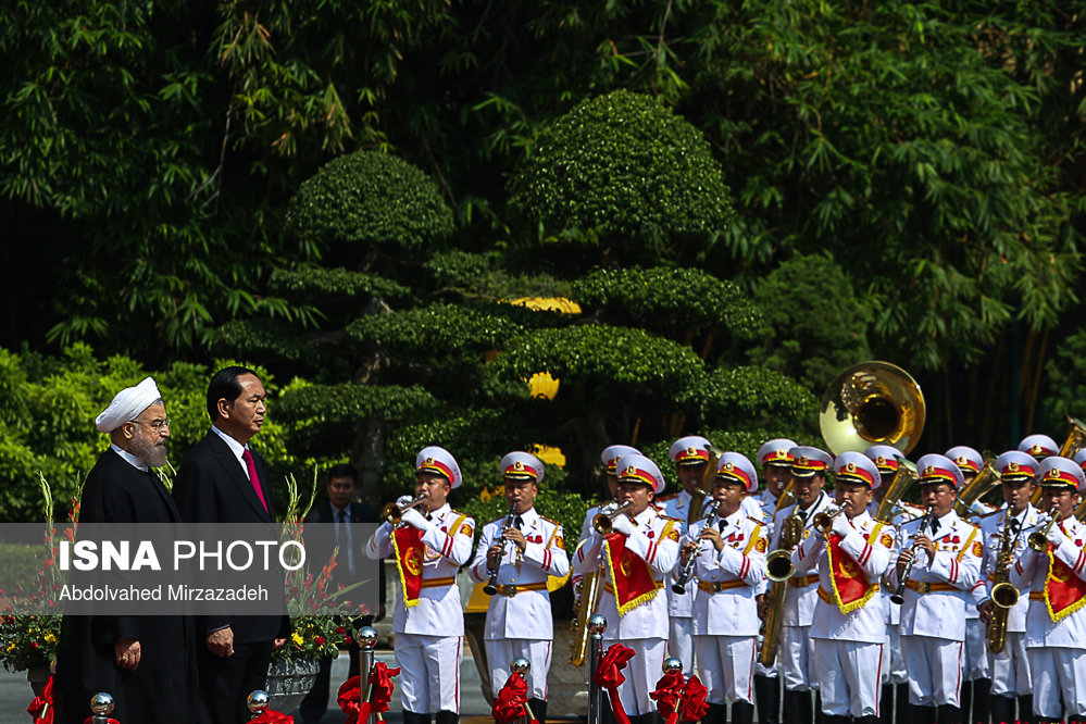 به گزارش ایرنا، در آیین استقبال رسمی از حجت الاسلام والمسلمین حسن روحانی، رئیس جمهوری کشورمان پس از نواخته شدن سرود ملی جمهوری اسلامی ایران و جمهوری سوسیالیستی ویتنام، روسای جمهوری دو کشور هیأت های عالی رتبه همراه را به یکدیگر معرفی کردند.