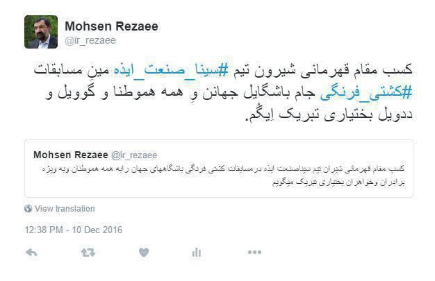محسن رضایی در توئیتر شخصی خود، قهرمانی تیم ایذهای را به زبان بختیاری تبریک گفت!