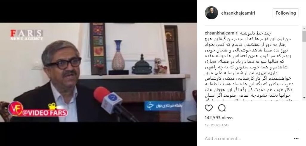 احسان خواجهامیری از گزارش انتقادی یکی از بخشهای خبری تلویزیون درباره کنسرت خوانندگان، گلایه کرد.به گزارش خبرآنلاین، احسان خواجه امیری با انتشار فیلم گزارش یکی از بخشهای خبری تلویزیون درباره فضای نامناسب کنسرتهایی که در کشور برگزار میشوند، در اینستاگرام نوشت: «من توی این فیلمها که از مردم من گرفتین هیچ رفتار به دور از عقلانیتی ندیدم که کسی بخواد بروز بده فقط شاهد خوشحالی و هیجان خوبی بودم که سرکوب همین احساسها میشه عقده که مثالهاشو به تعداد زیاد در فضای مجازی شاهدیم و همه خوب میدونن که به چه راهی داریم میریم من از شما رسانه ملی عزیز خواهشمندم اگر کار کارشناسی میکنی کارشناس دعوت میکنی که بگه اینها فساد هست لطفا یه دکتر خوب هم دعوت کن بگه اگر این هیجان های جوانها تخلیه نشود چه اتفاقی میوفتد اگر انسان عاشق نشود چه موجود خطرناکی میشود ما اگه دلمون نمیخواد خوشحال باشیم حداقل بتونیم شادی همسایه مونو و ببینیم نزنیم شیشه خونه شو بشکنیم.»