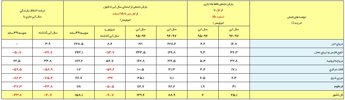 در حوضه آبریز خلیج فارس و دریای عمان، میزان بارشها ۱۲۹.۸ میلیمتر گزارش شده که این رقم در مقایسه با مدت مشابه سال گذشته ۴۶.۷ درصد کاهش و در مقایسه با متوسط ۴۹ ساله ۵۰.۷ درصد کاهش داشته است.