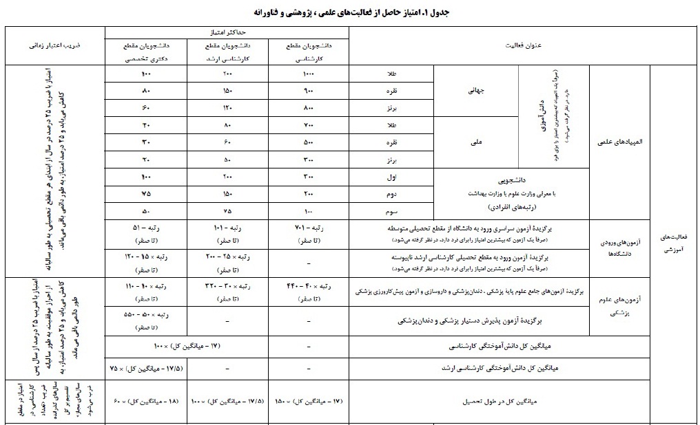 شیوه‌نامه اعطای جایزه‌های تحصیلی به دانشجویان صاحب استعداد برتر از سوی بنیاد نخبگان ابلاغ و در این شیوه‌نامه میزان امتیاز هر فعالیت مشخص شده است.