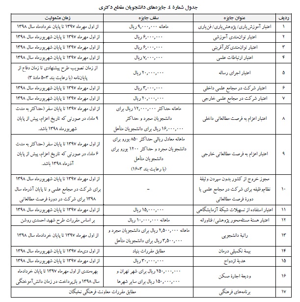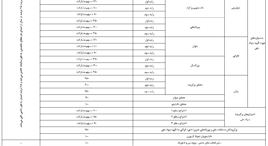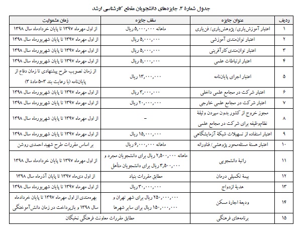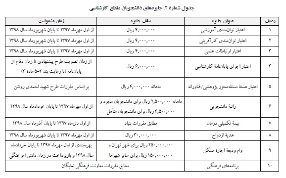 جایزه‌های دانشجویان مقطع کارشناسی بر اساس جدول شماره 2، دانشجویان مقطع کارشناسی ارشد بر اساس جدول شماره 3 و دانشجویان مقطع دکتری بر اساس جدول شماره 4 به مشمولان اعطا می‌شود.
