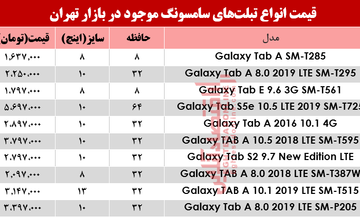 قیمت انواع تبلت سامسونگ در بازار +جدول