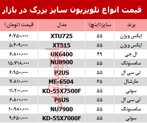 قیمت انواع تلویزیون ۵۵ اینچ و بزرگتر در بازار +جدول